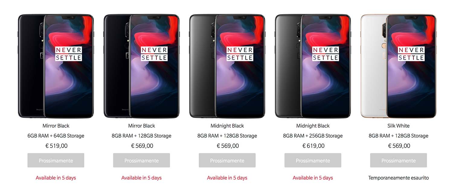 Sono presenti diverse colorazioni: la Silk White disponibile solo in versione 8/128GB, Midnight Black (effetto opaco/metallo) e Mirror Black. In più, domani verrà anche lanciata una Avengers Edition di OnePlus 6, non disponibile però in Italia.